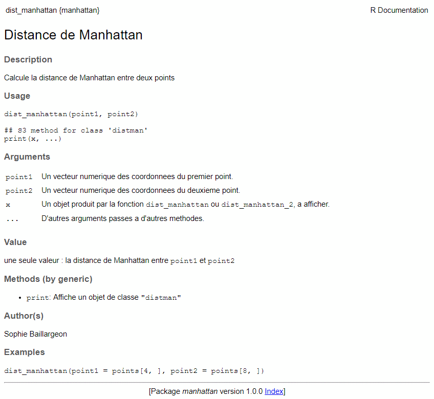 Dans ces notes, nous allons reprendre l’exemple de la fonction dist_manhattan qui calcule la distance de Manhattan entre deux points provenant des notes sur les tests et exceptions en R. Modifions un peu la fonction dist_manhattan afin que les objets quelle retourne possèdent une classe. Ensuite, créons une fonction équivalente, nommée dist_manhattan_2, qui fait le même calcul, mais en appelant la fonction dist du package stats. L’objet retourné par cette fonction doit posséder la même classe qu’un objet retourné par dist_manhattan. Finalement, créons une méthode associée à cette classe pour la fonction générique print afin de formater l’impression d’un objet retourné par n’importe laquelle de nos deux fonctions. Voici le code source de ces fonctions, qui formeront le package que nous créerons.