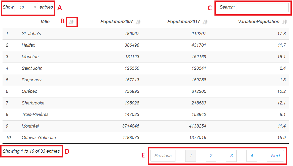 Le package DT permet de générer rapidement un tableau à partir des données présentes dans populationVillesCanada avec la commande datatable(data = populationVillesCanada). Nous remarquons rapidement qu’en plus des éléments standards d’un tableau (e.g. colonnes, lignes, entête), il y a des éléments interactifs supplémentaires. La sous-section ci-dessous présente ces différents éléments et leurs fonctions. La seconde sous-section présente le tableau (en vrai cette fois). Il est maintenant possible d’expérimenter avec ces nouvelles fonctions.